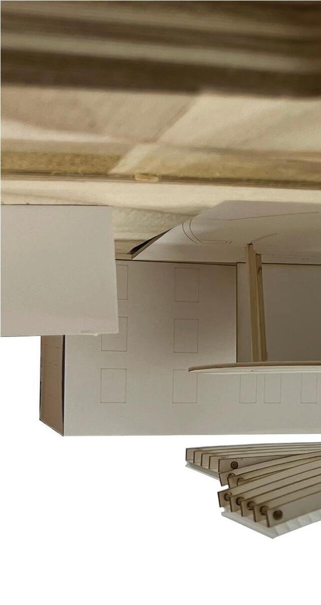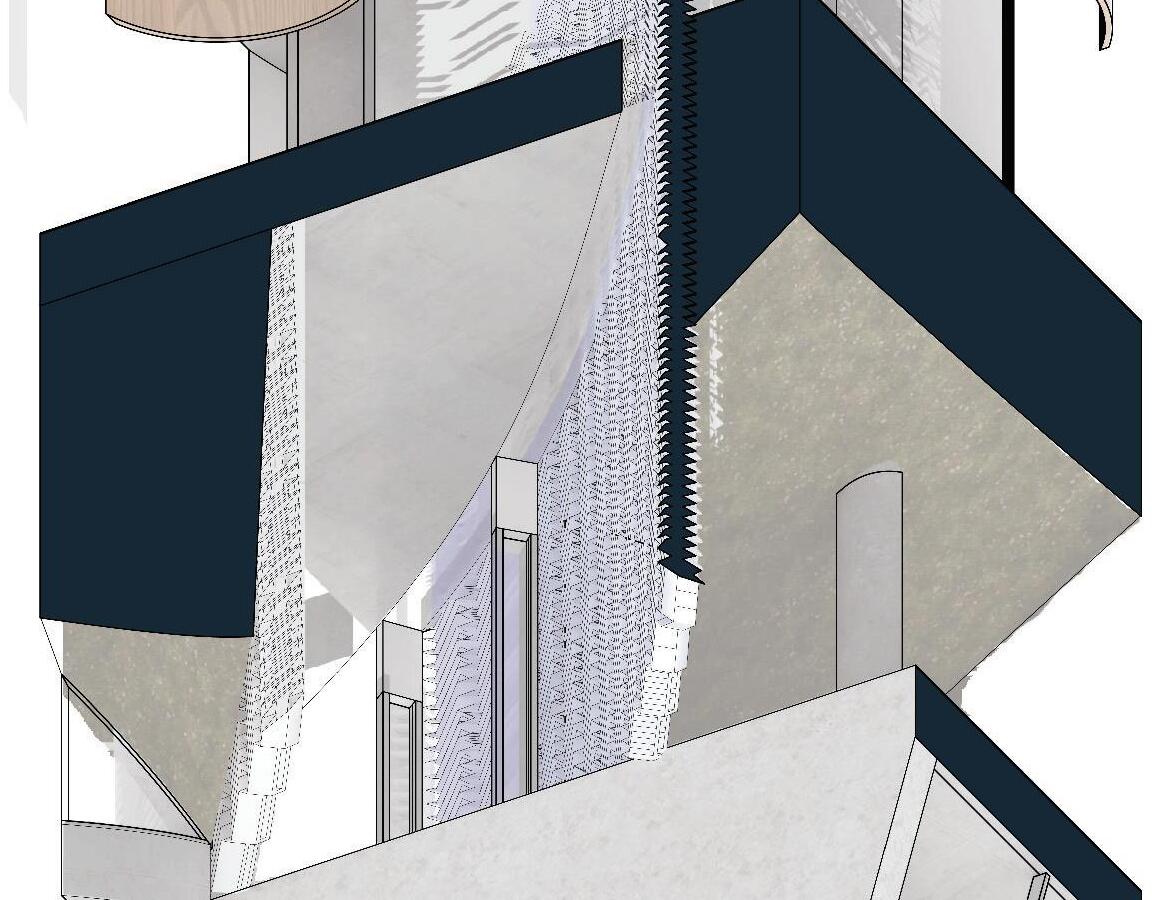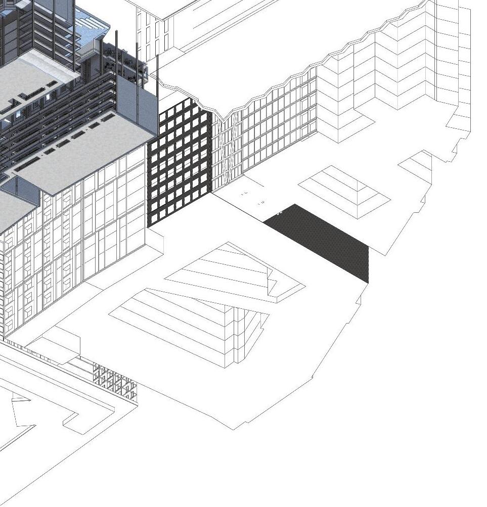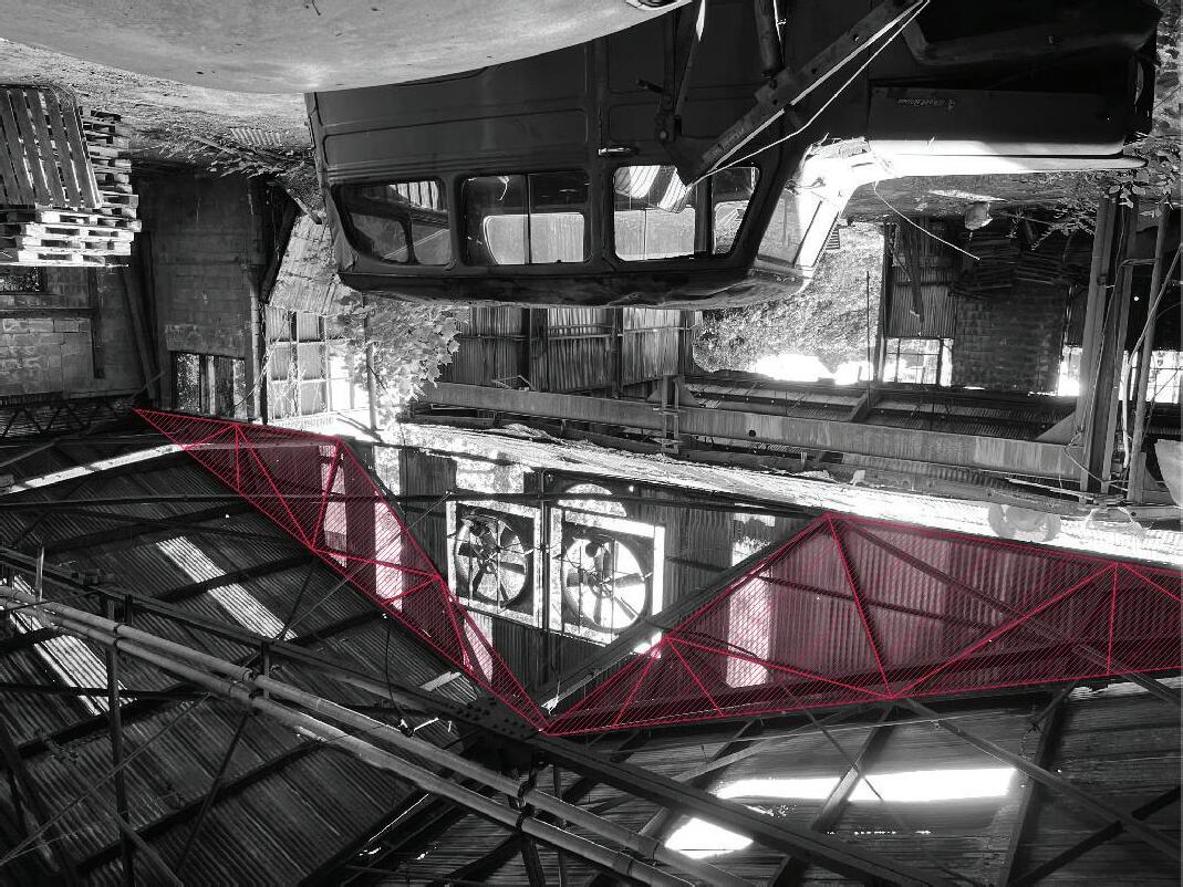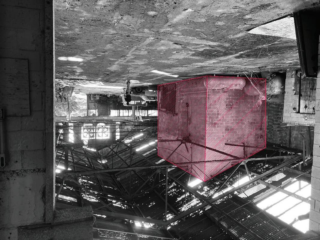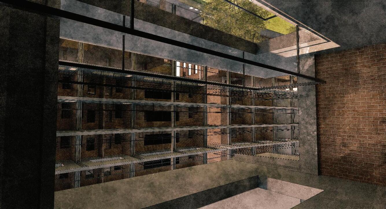 The existing warehouse contained three elements utilized in the sculptural adaptation, the wall, the trusses, and the volumetric CMU block spaces.