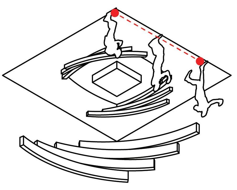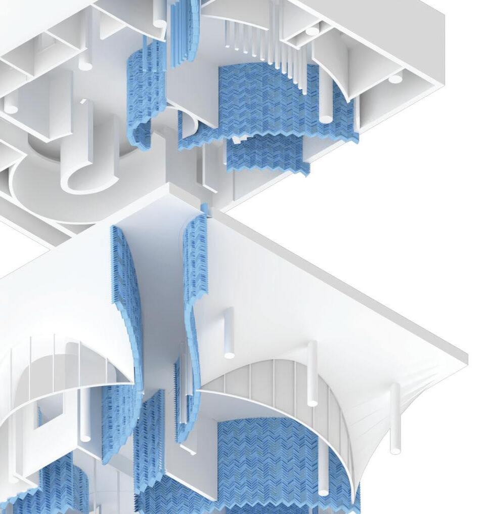 Underneath its three distinct, translucent canopies, a tri-level scheme can be found that blends both training spaces for self defense and boxing, as well as community learning classroom spaces. The scheme also includes a two story auditorium space designed for boxing shows and community events.