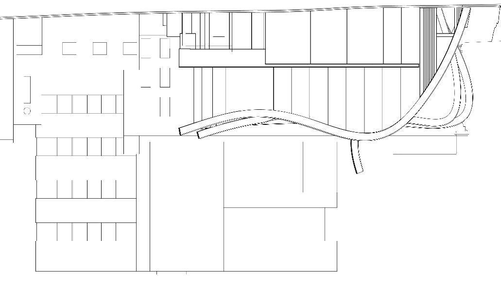 The upper level accommodates fitness equipment categorized by usage beneath each of the three canopies. From this expansive area, one can overlook the auditorium situated below. Perforated walls separate it from the classrooms on the Western side of the site. The lower level is dedicated to maintenance, offices, and a spacious locker room. The East elevation and West section emphasize the artistic features of the canopies, showcasing the building’s interaction with both the urban environment and the adjacent park area.