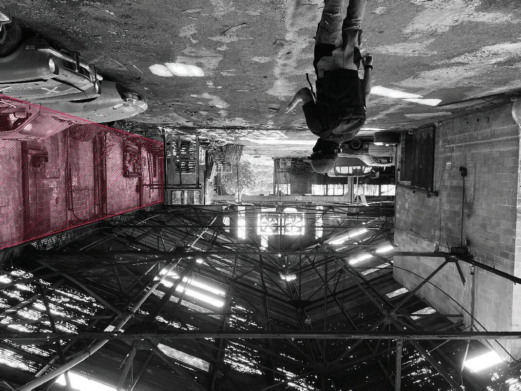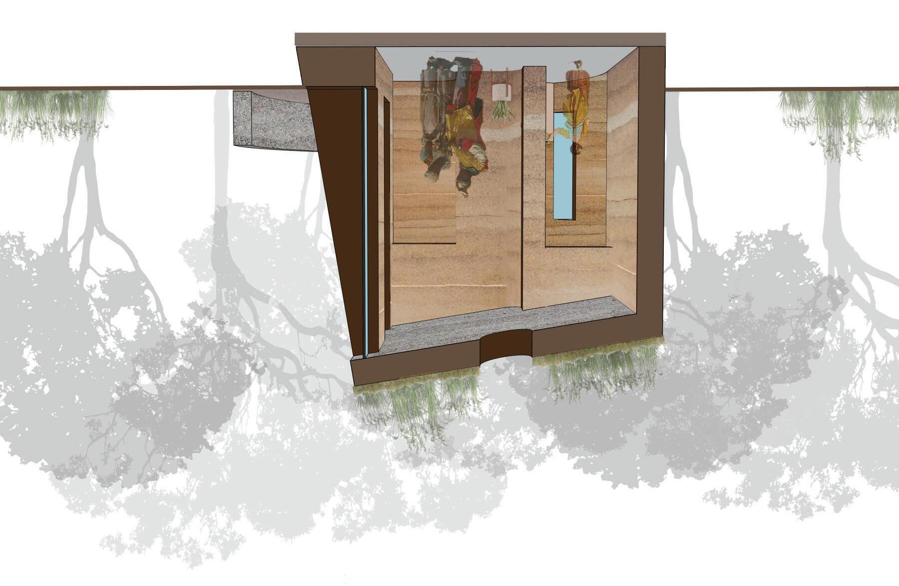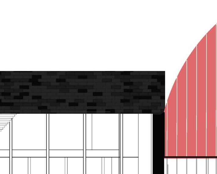 Crafted from basic components pre-existing in the space, the memorial hall and chapel exist as two halves of the structure. The chapel exists under the existing warehouse, the moment of sanctuary sheltered under the A-frame trusses. The main chapel is flanked by volumetric CMU chapels, giving a space for individual reflection and grieving. The memorial hall resides under an adapted truss, inverted to provide better views to the exterior, and allow for improved natural lighting. The hall is carefully placed into the Earth to create a double head height space, improving the flexibility and capacity of the space.