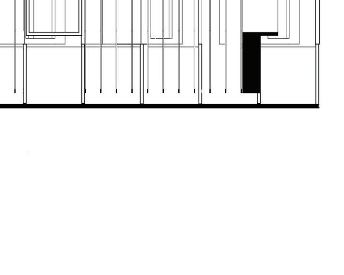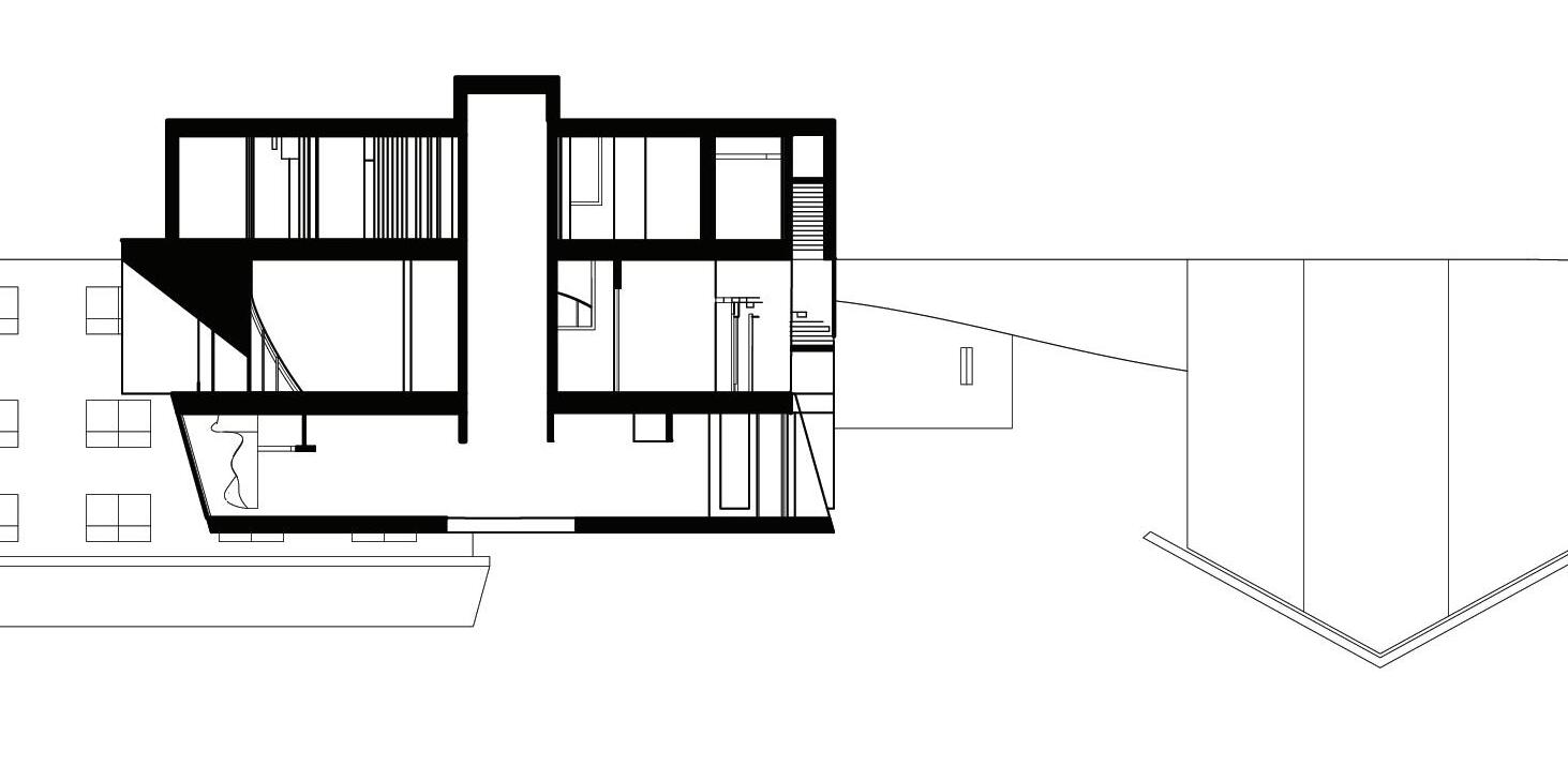 The section cut accentuates the interconnectedness across the three floors, primarily facilitated by the expansive open hydraulic elevator shaft. Serving as the primary circulation pathway, this shaft also functions as a prominent skylight, illuminating all three floors with natural light.