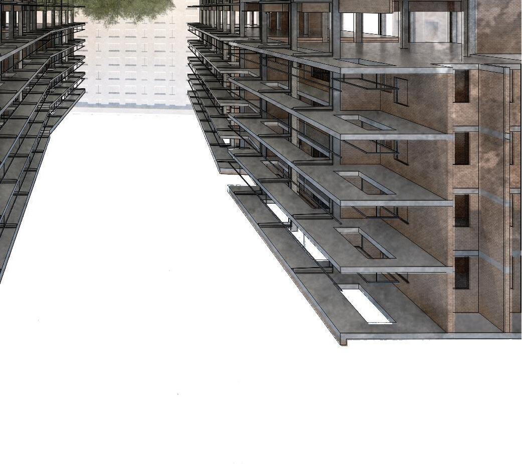 On the ground floors, the project transforms from repeated slabs to more traditional rowhouse forms, allowing for subcommunities of residences and retail spaces to be made. These have access from both the courtyard and the exterior street, to bring the most energy to the space.