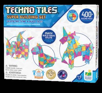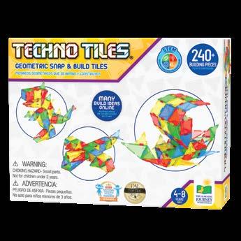 Turn basic shapes into grand masterpieces with these new Techno Tiles themed sets. Simply connect the shaped tiles with the snapon two-way and four-way connectors and watch your structures come to life! These 100+ piece sets include squares, small triangles, large triangles, two-way connectors, four-way connectors, and accessories like stickers and wheels to escalate your build to the next level! Techno Tiles are a great tool to learn about basic geometry, construction, engineering, and architecture! These products align with and support STEM (Science, Technology, Engineering, and Math standards). Ages 5-10 years.