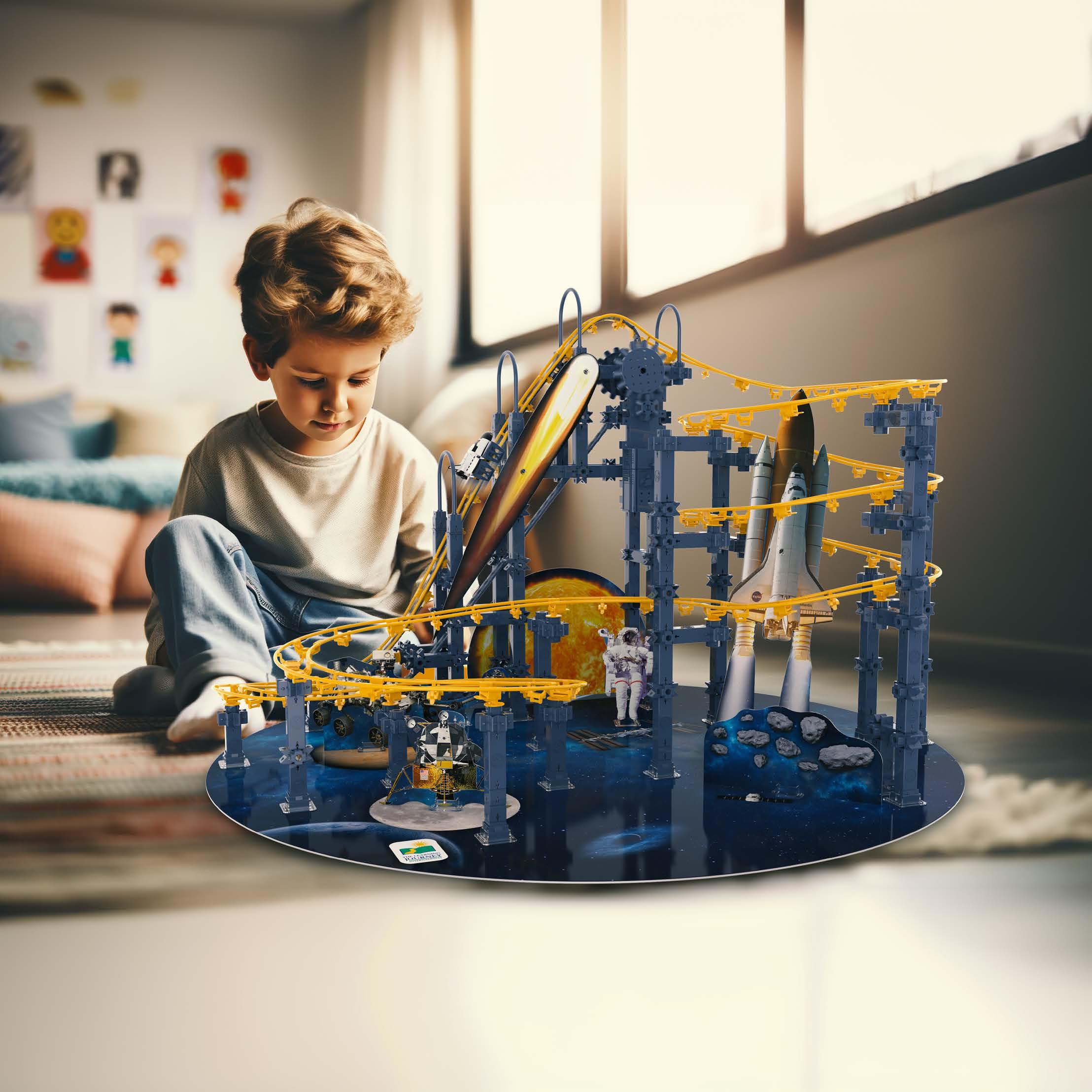 200+ pieces with dual corkscrew lifters and two additional base boards for additional builds. Requires two “AA” batteries (not included).