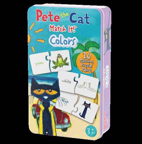 Pete The Cat Match It! Game Tins teach kids about colors and counting using Pete’s friends and other objects featured in his books in a fun and interactive way. Each card has two pieces - a picture of objects and a matching card that spells the color or number of the objects. By simply matching the pieces together, children will learn to recognize the spelling of simple words, learn their colors, and practice their counting skills. The puzzle pairs are self-correcting—only correct object and name combinations will fit together. Each set contains 20 matching puzzle pairs. Recommended for ages 3+ years. Pete the Cat ©️ 1999, 2010 Pete the Cat, LLC.