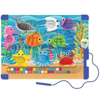 Learn the basic colors by using your magnetic pen and placing all the corresponding-colored magnetic pieces to their proper color bins.