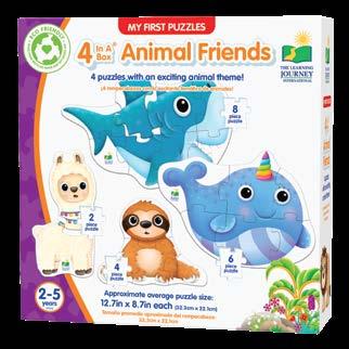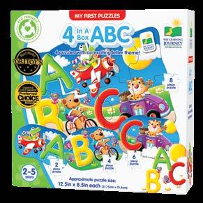 My First 4-In-A-Box® Puzzle Sets are great “starter” puzzles and will help little hands develop their fine motor skills. My First 4-InA-Box® Puzzle Sets contain four puzzles depicting fun characters and concepts that your young ones will easily recognize. The puzzles progress from two pieces to four pieces to six pieces to eight pieces, giving your child the opportunity to grow with the set as they grow and develop. My First 4-In-A-Box® Puzzle Sets are a great way to help your toddler begin building their tactile and problem solving skills. Each puzzle measures approximately 12.5” x 8.5” (31.75cm x 21.59cm). Ages 2-5 years.