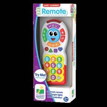 Your baby and toddler can channel surf through numbers, colors, and shapes with the On the Go Remote! The remote has multiple buttons that react with sounds and lights and will keep your child engaged for hours! Learning about shapes, numbers, ABCs, and music is big fun for your little one with the On the Go Remote. Requires two “AA” batteries (included). Ages 3 months - 3 years.