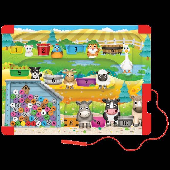 Learn the numbers 1 through 10 by using your magnetic pen and placing all the corresponding-colored number pieces to their proper numbered bins.