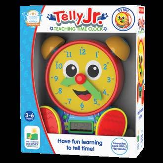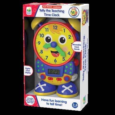 I t’s never too early to learn how to tell time! Let Telly Jr. Teaching Time Clock help your child learn to tell both analog and digital time using two learning modes. In learning mode, Telly Jr. teaches time in five-minute increments when the hands are moved, updating the LCD screen. In quiz mode, Telly Jr. asks your child to move the hands on the clock face to match the time displayed on the screen. When turned off the LCD screen becomes a real working clock! Requires three “AA” batteries (included). Ages 3-6 years.