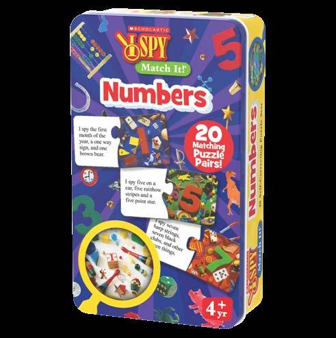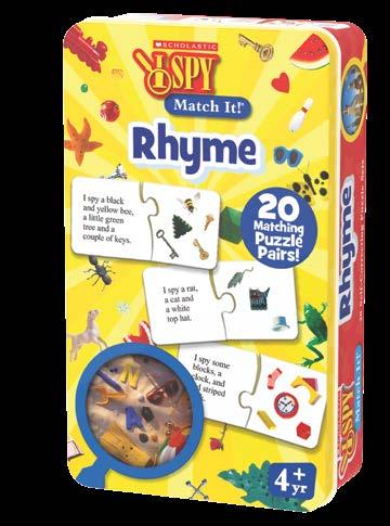 Learning numbers, vocabulary, and rhymes has never been this much fun! I Spy Match It! Numbers and I Spy Match It! Rhyme include colorful sets of rhyming puzzle cards that provide children with an excellent introduction to rhyming words, numbers, and basic vocabulary. The puzzle cards feature 20 pairs of cards with a rhyme featuring rhyming words or numbers on one side and pictures of the objects that associate on the other . The cards are also self-correcting — only cards with the correct answer will fit together. These Match It! Games are a fun way to build problem solving skills by working out basic riddles and rhymes. Recommended for ages 4+ years. I Spy™️ & ©️ 2025 Scholastic Inc.