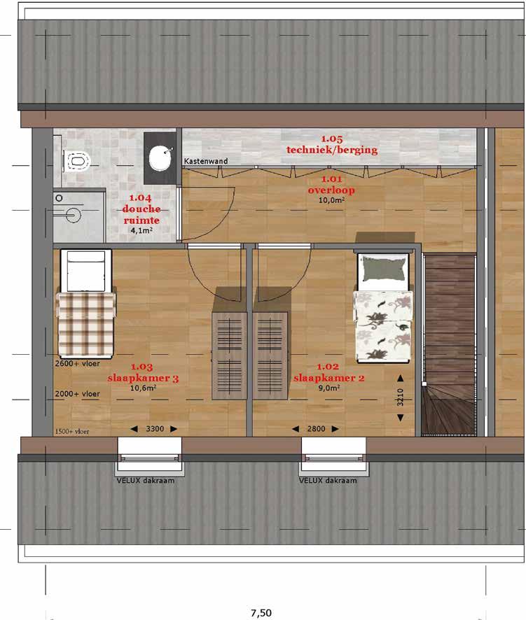 Onder de schuine kap van de woning worden op de 1e verdieping twee slaapkamers, een badkamer en toilet gerealiseerd. Indien bijvoorbeeld een alleenstaande oudere geen behoefte heeft aan het gebruik van de verdieping, dan kan de toegang tot de verdieping worden afgesloten.