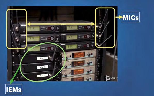 Since antennas always interfere with each other’s performance, use antenna distros for your wireless mics and antenna combiners for IEMs. The goal is to have one A/B pair for the mics and one transmit antenna for the ears. The preferred