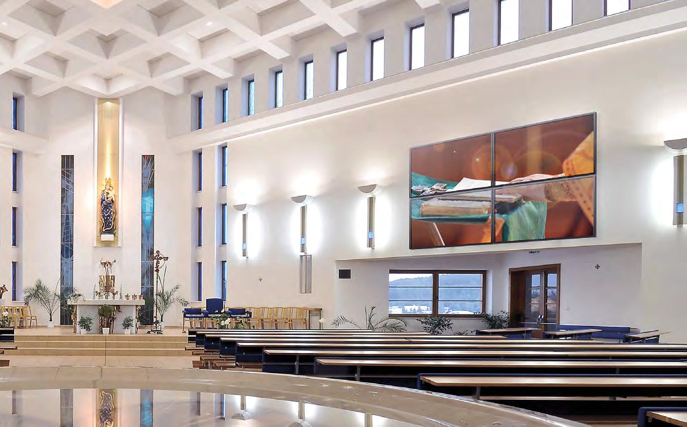 the terrace and the corridor which is an outdoor area that has its own specific lighting level and is generally between 300–500 lux. Projectors and screens are often installed in indoor areas due to lowlevel lighting, with screen sizes and projector brightness being subject to several factors such as viewing distance of the congregation, lux level and screen gain. However, the main challenges for this solution are about aesthetic value in that users are sensitive to seeing any visible mounting bracket for the screen and projector. For this reason, a short-throw projector, pantograph lift and customised screen enclosure box installation are being commonly used to overcome this challenge. Alternatively, there are options to consider using a multi-display videowall or LED videowall to replace the screen and projector solutions if there is enough money in the budget. Typically, the narrower the gap bezel of the display, the higher the cost. The same goes for LED panels for narrow pixel pitch.