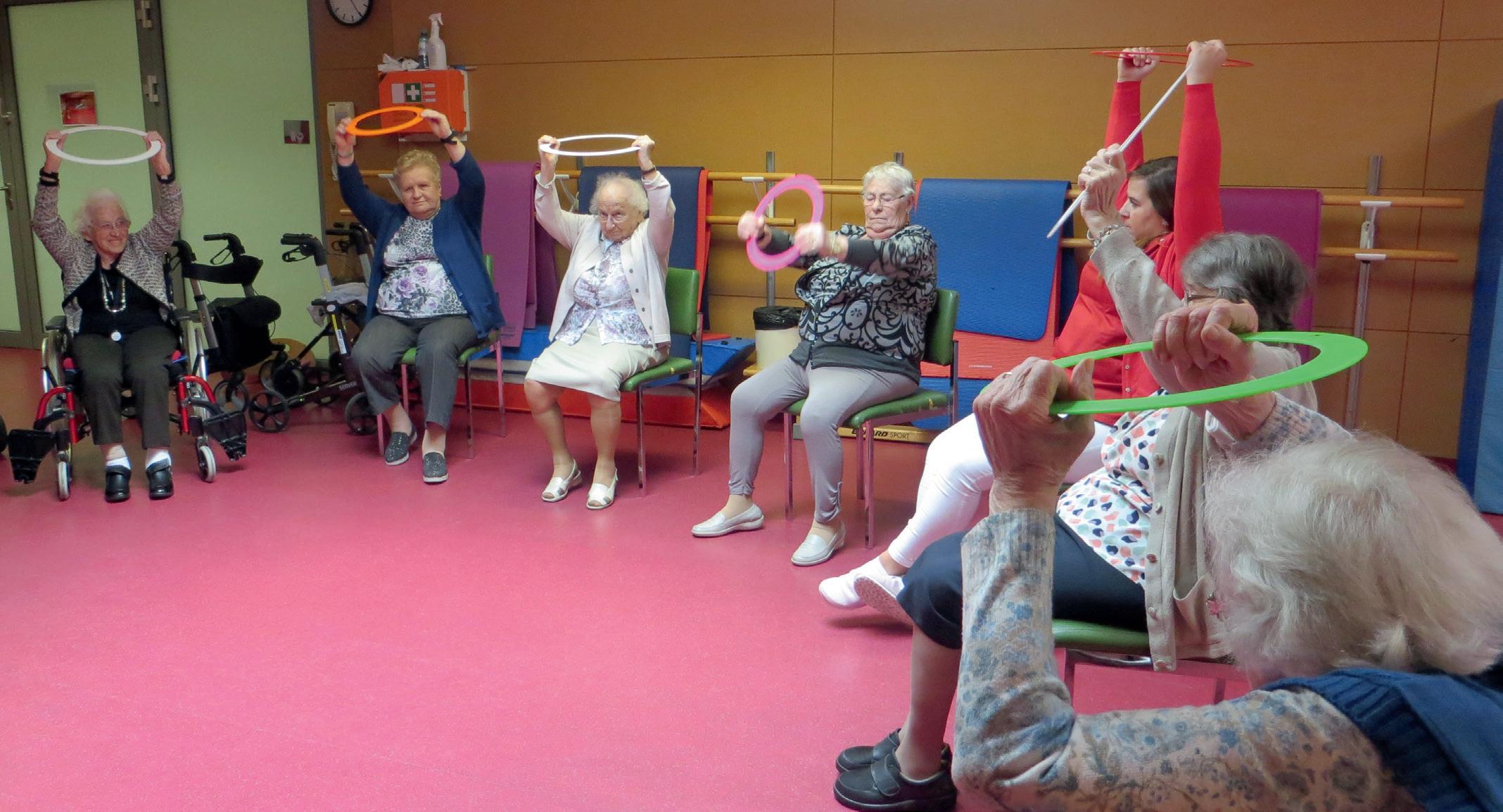 Bewunner des Aktivitéit un D’Lexy (Psychomotricienne) an d’Martine (Ergotherapeutin) hunn un enger Formatioun «Tanz mit Rollator» deelgeholl a setzen dat Geléiert elo mat hire