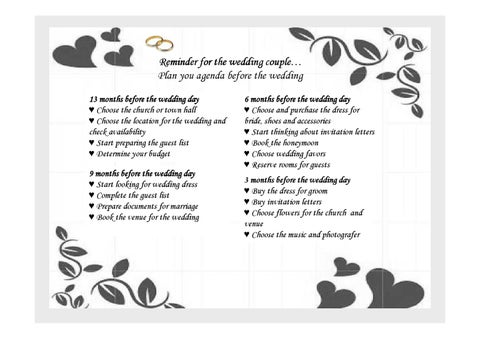 Reminder for the wedding couple… Plan you agenda before the wedding 13 months before the wedding day ♥ Choose the church or town hall ♥ Choose the location for the wedding and check availability ♥ Start preparing the guest list ♥ Determine your budget 9 months before the wedding day ♥ Start looking for wedding dress ♥ Complete the guest list ♥ Prepare documents for marriage ♥ Book the venue for the wedding