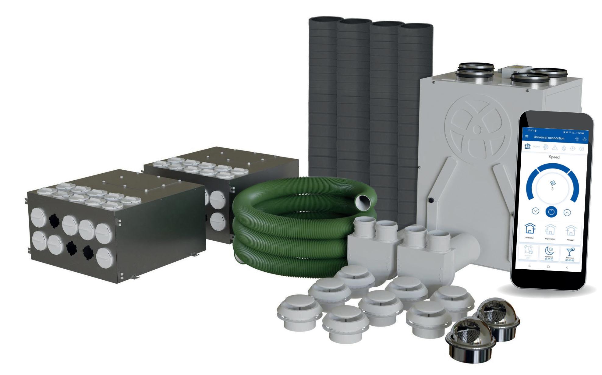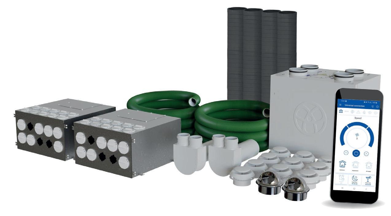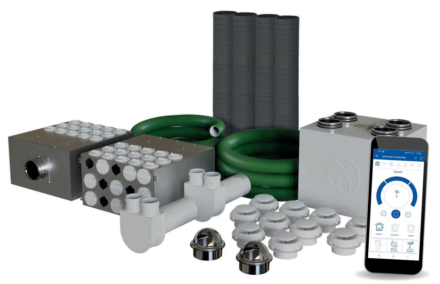 • Side connection, horizontally mounting supply and extract heat recovery unit.