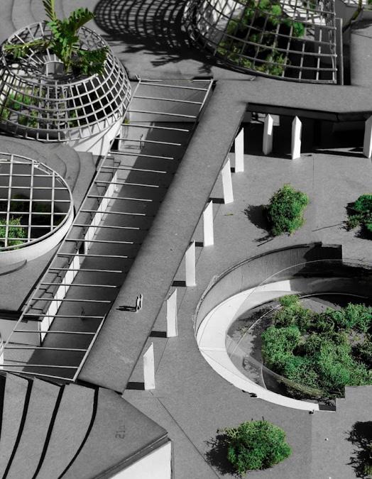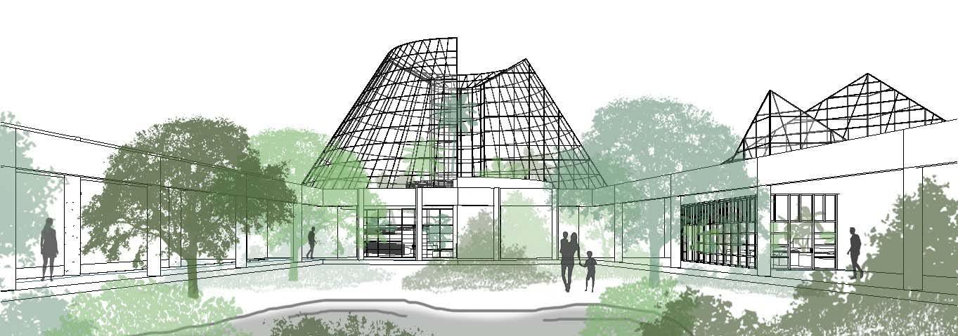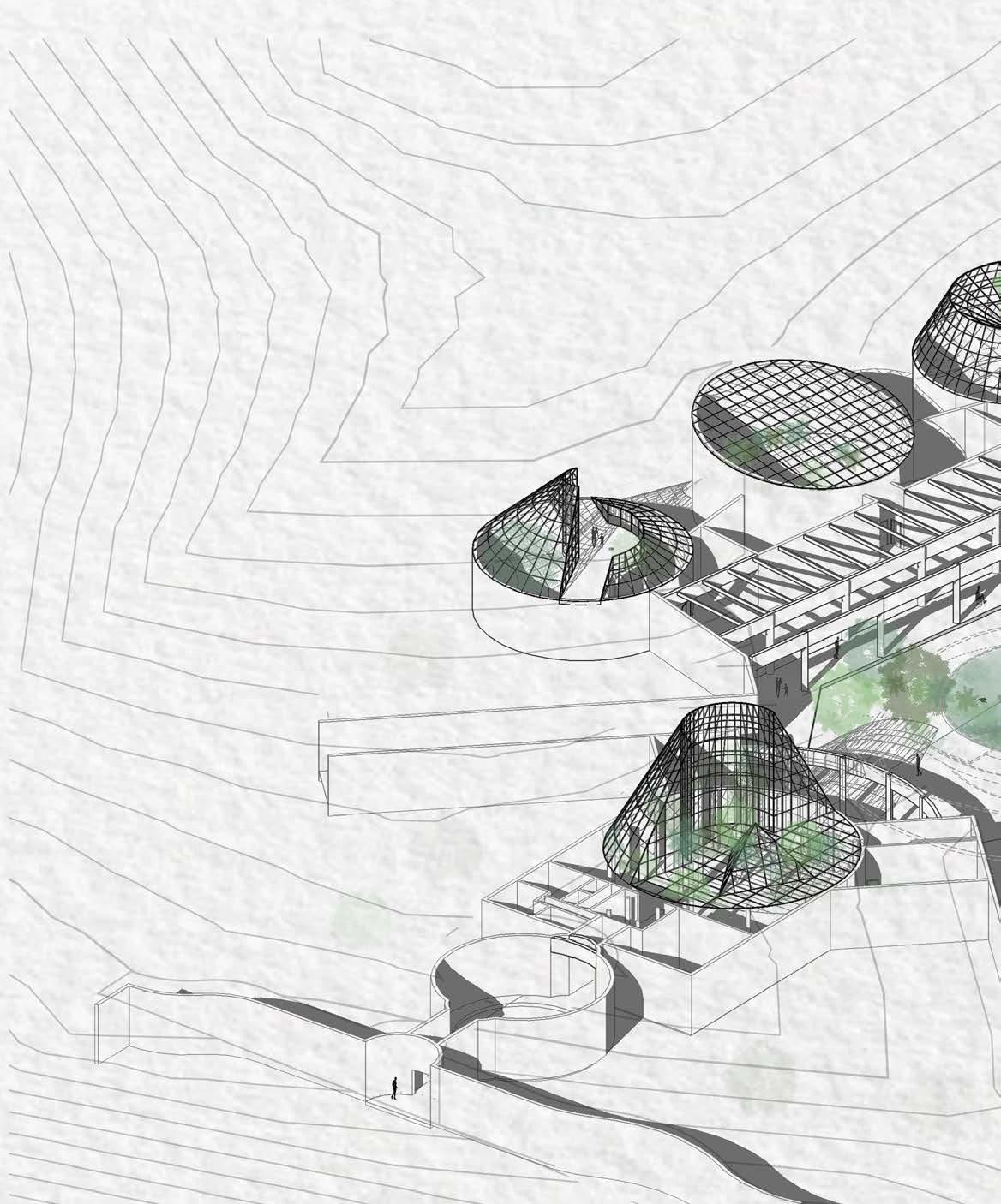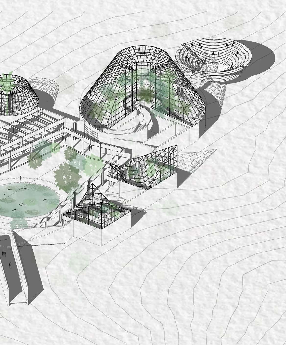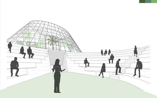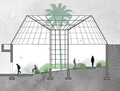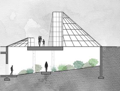 research / reconstruct / expand lucile halsell conservatory, located in the san antonio, texas botanical gardens, exemplifies emilio ambasz’s trademark style, coined “green over gray.” the expansion consists of four new pieces continuing the pattern of fragmented buildings on site. the new installations follow the current flow of circulation by adding new stops while maintaining the same balance around the central sunken courtyard; both in the above ground geometric roof forms and below ground floor plan.