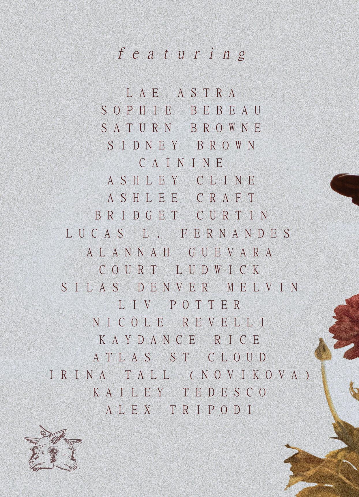 02/ Gentle by Bridget Curtin 16/ Girl and unicorn goose by Irina Tall Novikova 23/ Temporal Part by Court Ludwick 25/ Cicada by CAININE 27/ The Abject by Court Ludwick 28/ Self-Portrait as Brain Scan by Court Ludwick 30/ Magdalene by Liv Potter 35/ BEEN A SON by Alex Tripodi 40/ Growing in Places You Never Imagined You’d Bloom by Ashlee Craft 43/ Spring Galaxy by Bridget Curtin I./ Contributor Bios
