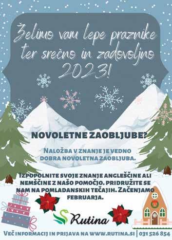 25 Oglasna stran POGREBNE STORITVE NOVAK Anton Novak d.o.o. Hraše 19, Lesce www.anton-novak.si Sprejemamo naročila za sveče in suhe ikebane, žalne ikebane, šopke, poročne šopke in aranžmaje ter aranžiranje daril. Velika izbira sveč. DEŽURNA SLUŽBA: 040 887 169, 041 655 987, 040 887 112 NOVO NOVO NOVO NOVO CVETLIČARNA NOVAK pri pokopališču na Bledu prevozi in ureditev pokojnikov ter pokop z žalnim sprevodom velika izbira krst in žar ureditev vseh potrebnih dokumentov organizacija in izvedba pogrebnih ceremonialov na pokopališčih v občinah Bled, Gorje, Radovljica in Bohinj. Gorenjska ulica 38, Ribno, 4260 Bled E-mail: info@vrtko-sp.si Tel./fax: +386 (4) 574 20 30 GSM: +386 (41) 744 207 www.vrtko-sp.si ČIŠČENJE NOVO ZAPADLEGA SNEGA IZ PARKIRIŠČ, DVORIŠČ, DOVOZNIH POTI IN PLOČNIKOV ... Zahvaljujemo se vsem strankam in poslovnim partnerjem za sodelovanje v letu, ki se izteka. Obenem vam želimo lepe božične praznike in srečno ter zdravo novo leto 2023! Vaš Vrtko team DARILNI BON pri nakupu korekcijskih očal OPTIKA MESEC JESENICE, Cesta maršala Tita 31, 4270 Jesenice, T 04 583 26 63 Želimo vam vesel božič in srečno novo leto 2023! Veljavnost bona je do 28. 2. 2023. OPTIKA MESEC BLED, Ljubljanska cesta 11, 4260 Bled, T 08 205 77 07 www.optika-mesec.com 25 € srečno 2023!