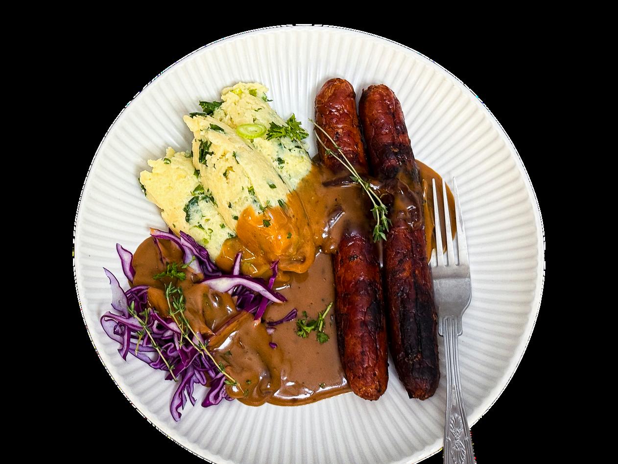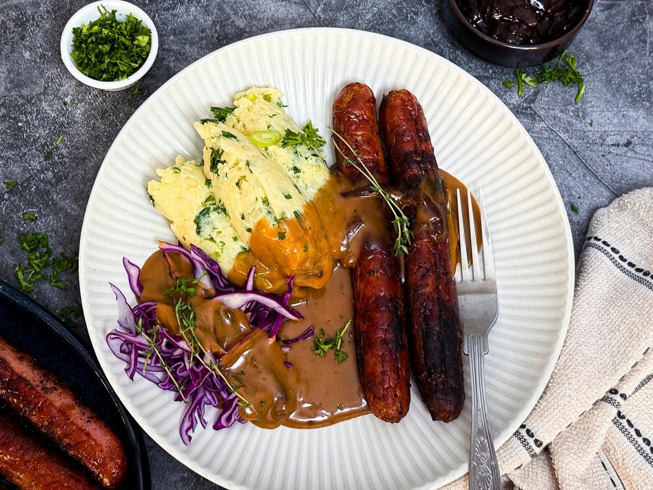 A classic that never goes out of style. This version of bangers and mash combines creamy spring onion and kale mash with juicy sausages, braised red cabbage and a rich red onion pepper sauce made simple with Blenders. A comforting plate that’s perfect for pub menus, canteens or family dining.