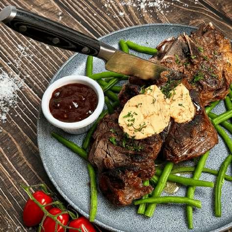 A premium bone‐in ribeye (cowboy steak) seared hard to build a deep crust, then basted with butter, rosemary and thyme. Topped with a compound butter of Blenders Sweet Tomato Relish and parsley, this dish delivers a balanced sweetness and tang while remaining easy to execute on the line. The green beans are blanched until tender‐crisp to offer a fresh contrast. Preparation is minimal, making it ideal for upscale bar, casual dining or steakhouse menus.