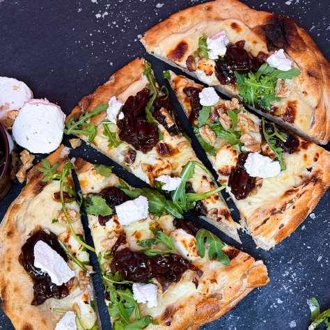 Creamy white sauce, tangy goat’s cheese, toasted walnuts and sweet Blenders Red Onion Relish come together on a crisp pinsa base. Finished with fresh rocket and Parmesan, this pinsa is simple to prepare yet full of flavour. The relish adds sweetness, the goat’s cheese brings sharpness, and the white sauce ties it all together. A standout option for casual dining, sharing menus or bistro boards.