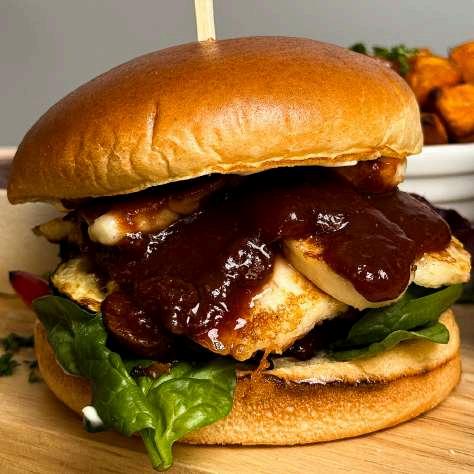 3.Heat a grill pan or plancha over medium–high heat. Without adding oil, grill the halloumi slices for 2–3 minutes on each side until golden and crisp Split the burger buns and toast cut‐side down in a dry pan or under the salamander for 1–2 minutes until lightly browned