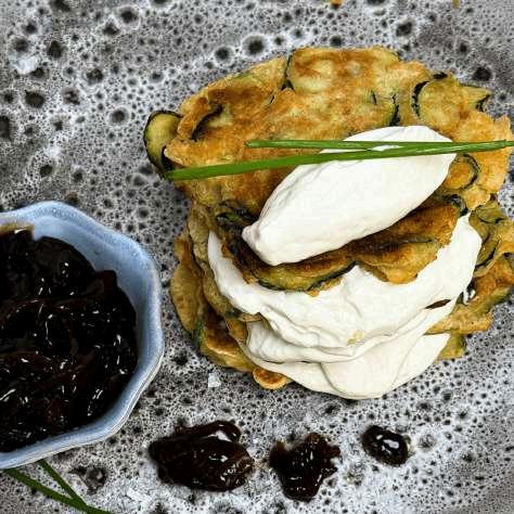 Light, crisp and full of flavour, these courgette fritters are served with whipped cream cheese and finished with Blenders Red Onion Relish. Simple to prepare and easy to plate. The relish adds a sweet tang, the cream cheese brings balance, and the fritters stay golden and crisp, making this a versatile dish for starters, sides or sharing plates.