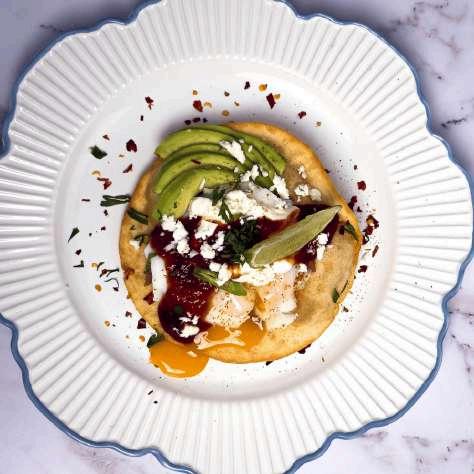 Crisp tostadas layered with refried beans, poached eggs, melted cheese and a spiced Blenders Sweet Tomato Relish. Finished with sour cream, avocado and fresh coriander, this dish is bold, colourful and perfect for brunch, light lunches or sharing menus.