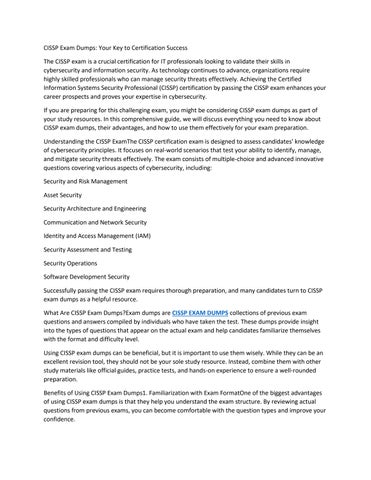 Dumps?Exam dumps are CISSP EXAM DUMPS collections of previous exam questions and answers compiled by individuals who have taken the test. These dumps provide insight into the types of questions that appear on the actual exam and help candidates familiarize themselves with the format and difficulty level.