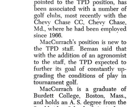 Sam DiPinto, of the Lido Golf Centre, accepted the superintendent position at the Beverley Golf Club. Steve Miller moved from being assistant at the Toronto Board of Trade Country Club to Dundas Valley Golf Club as superintendent. Jack Harris retired from the Hamilton Golf Club to build his own golf course called Knollwood Golf Course. Stuart Mills moved from London Highland Golf Club to Hamilton Golf Club. Graham Shouldice took over as superintendent at the Highland Golf Club.