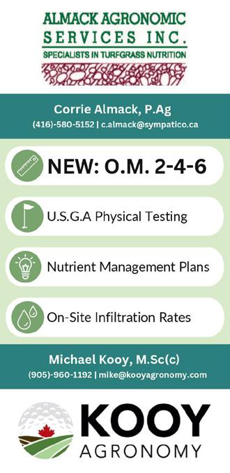 By implementing even some of these practices, you will start to notice a change in your body as well as a shift in your perspective. You will experience a response to things as opposed to a reaction, your mind will feel less clouded allowing your focus to be sharp. Think of it as topping up your soils with fertilizer, what is the turfs response? Vigorous growth, rich colour and strength to withstand added stress. For those of you that attended the 2024 Ontario Golf Course Management Conference and sat in on Pat Jones’ session, Double-Edge Sword of Superintendent Culture, you may recall him touching base on the topic of work/life balance. He shared an inspiring perspective. He suggests looking at a work/health balance yet not even balancing them but intertwining the two to be cohesive. The takeaway from this session was clear. It is important to reinvent your way of thinking (and doing) for longevity of the greater good in oneself as well as finding ways to become proactive and eliminate the reactive. ■