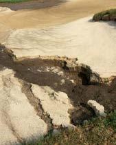 stripped and sodded with new bluegrass while the bunker edges and fingers on those holes were sodded with a three-way blend of Kentucky Bluegrass, Turf Type Tall Fescue, and Fine Fescue. The edge of the bunkers on these holes was established using soil filled burlap bags. The remaining bunkers on the golf course were edged by hand and rolled over to create a bull-nose appearance.