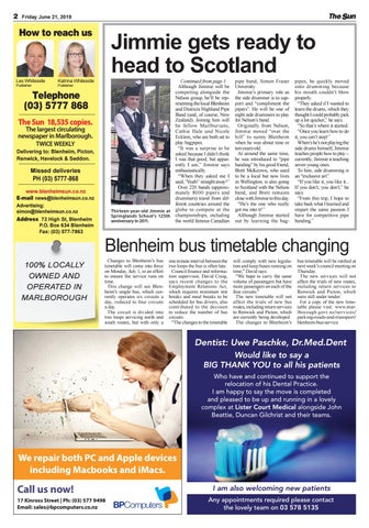 PH (03) 5777-868 www.blenheimsun.co.nz E-mail news@blenheimsun.co.nz Advertising: simon@blenheimsun.co.nz Address 72 High St, Blenheim P.O. Box 634 Blenheim Fax: (03) 577-7863