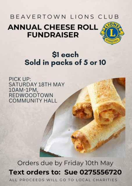 The Beavertown Lions Club is once again taking orders for their ever popular cheese rolls fundraiser which is now in its seventh year. Guaranteed to be the best cheese rolls you’ll ever have, they will be lovingly prepared by a wonderful team of volunteers from the Beavertown Lions Club. This kiwi delicacy is a must as we head into the colder months, but you’ll need to be quick and get your order in by this Friday 10th May. Text your order to Sue 027-555-6720 as soon as possible. Your order will be available to pick up on Saturday 18th May, between 10am and 1pm at the Redwoodtown Community Hall.