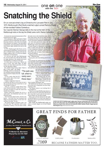 Snatching the Shield On an overcast winter’s day at Christchurch’s Lancaster Park in July, 1973, Marlborough’s Red Devils snatched rugby’s prized Ranfurly Shield off star-studded holders Canterbury. Sun reporter Damian George talks to the man at the helm of the Marlborough side on the day the Shield came north, Ramon Sutherland. It remains the most prized possession in New forwards were in the Canterbury team, so we Zealand provincial rugby. knew them pretty well and we knew we had First contested in 1904, the Ranfurly Shield to dominate up front if we were going to win (donated by the Earl of Ranfurly, the country’s and we were pretty confident we could do that.” Governor General at the time) has brought As with most provincial areas, the hisboth jubilation and despair; it has galvanised toric piece of silverware created a buzz in communities; and it has produced some of the Marlborough which will be hard to match. most famous rugby matches ever seen in this Crowds flocked to Blenheim’s Lansdowne country. Park to watch local stars like All Black No In 1973, Marlborough’s Red Devils, led by 8 Alan Sutherland (Ramon’s brother), first captain Ramon Sutherland, carved out its own five-eighth Tony Goddard, loose forward piece of Shield history, etching itself into the David Neal and, of course, Ford, during six trophy’s folklore with a 13-6 win over holders successful defences. Canterbury in Christchurch. “The park was full, which is rarely seen these It is the one and only time Marlborough days,” Sutherland says. has won the shield and, with the Red Devils ‘It was great, and a real talking point for the no longer playing in the national provincial town.” championship, it is likely to be the last. Even through the professional era, the RanIt is often said to win the Log o’ Wood, you furly Shield has held its appeal and remains the have to really “play some rugby”. In other most hotly-contested prize among provincial words, you must chance your arm, be brave, unions, both big and small. run the opposition ragged. “It’s huge for the area it goes to. It’s just unBut, despite being a team which “liked to fortunate that in this professional area it doesn’t play 15-man rugby”, this Shield get much exposure, because it’s challenge, played in overcast but “The park was the only thing that really draws dry conditions, produced anything people to a provincial game. but an expansive display from the full, which is “If it’s a Shield game, there visitors. seems to be a lot more interest.” “It was a pretty dour sort of a rarely seen The Tasman side (an amalgame, pretty close all the time,” gamation of Marlborough and these days.” Sutherland recalls. Nelson Bays), almost won the “I think it might have been 6-6 Log o’ Wood three years ago, at halftime and then we sort of got on top in when it pushed Wellington close. the second half and Ford scored that try and But Sutherland says the team, which finished we managed to hang on.” last in this year’s competition, has been disap‘That try’, scored by winger Brian Ford, pointing to date. came after the speedster “burst out of a ruck” “The Makos system is not working like it and sped 70 metres to clinch the match four was designed to. minutes from fulltime. “There’s not enough Marlborough players in History books have labelled the win as a the side, but you can’t blame [the selectors] for “great upset”, but Sutherland says this is far that ‘cause they’ve got to pick the best players from the reality. and our players are not good enough. “The team had played pretty well the year “We’ve got to lift the standard of club rugby before – we’d had wins over Auckland and in Marlborough so we can get more players in Otago in provincial games, so the team was [the team], and we’ve got to attract more players starting to develop,” he says. to Marlborough.” Then, maybe, the Marlborough region can “We played against Canterbury quite a bit over the years. We especially used to play write a second chapter in its brief Shield Canterbury Country a lot and most of their history.