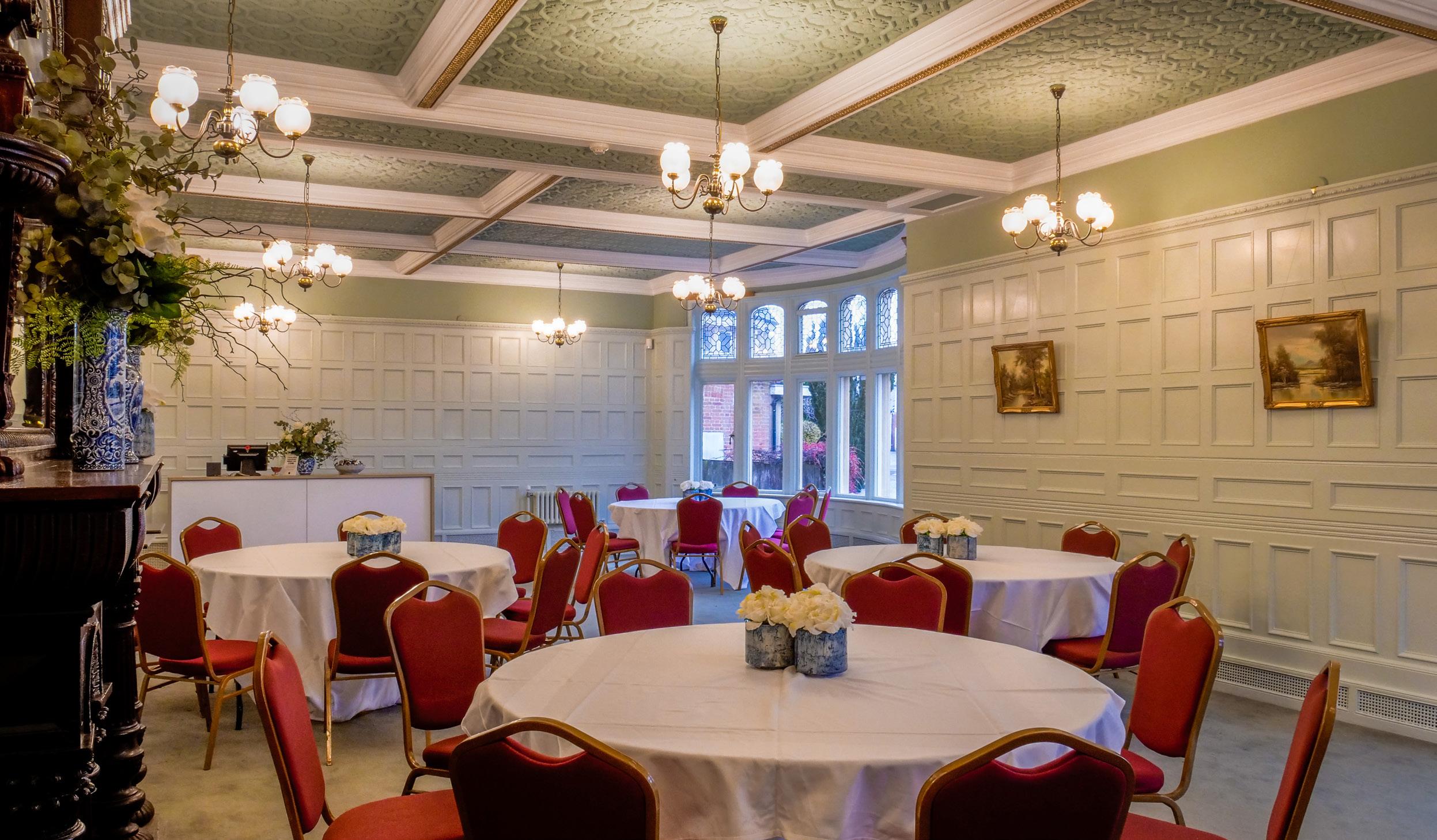 The elegant Dining Room brings an air of period luxury to any gathering, whether meeting or dinner. The large windows overlooking the grounds offer natural light, while the white wood panelling and Victorian fireplace delivers a hint of charming sophistication.