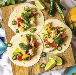 4. I normally serve everything individually in separate bowls on the table to allow guests to put them together themselves however if you wish to assemble them it’s a simple process of scattering the cooked fish over the warm tortillas followed by the lettuce, diced tomatoes, coriander and a dollop of the mango salsa.