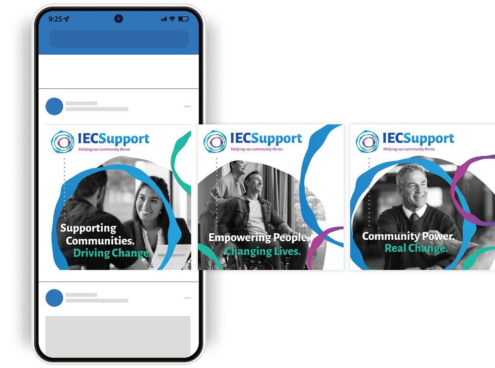 IECS imagery should always re�lect a positive, encouraging mindset. Any images used should ideally be real photographs, though icons and illustrations can be used in certain circumstances such as infographics. Images should be relevant and reflect people being helped and happy, being supported and looked after. Positive outcomes and wellbeing through dealing with IECS are paramount to the brand. Black and white imagery is to be used as the main element with the other brand elements (rings, logo, call to actions) bringing colour to the design. Colour imagery may be used, but as a secondary design element.