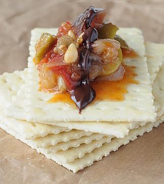 Caponata is a Sicilian eggplant relish made from chopped fried vegetables (mostly eggplants and peppers), seasoned with celery, olives and capers, in a bittersweet sauce.