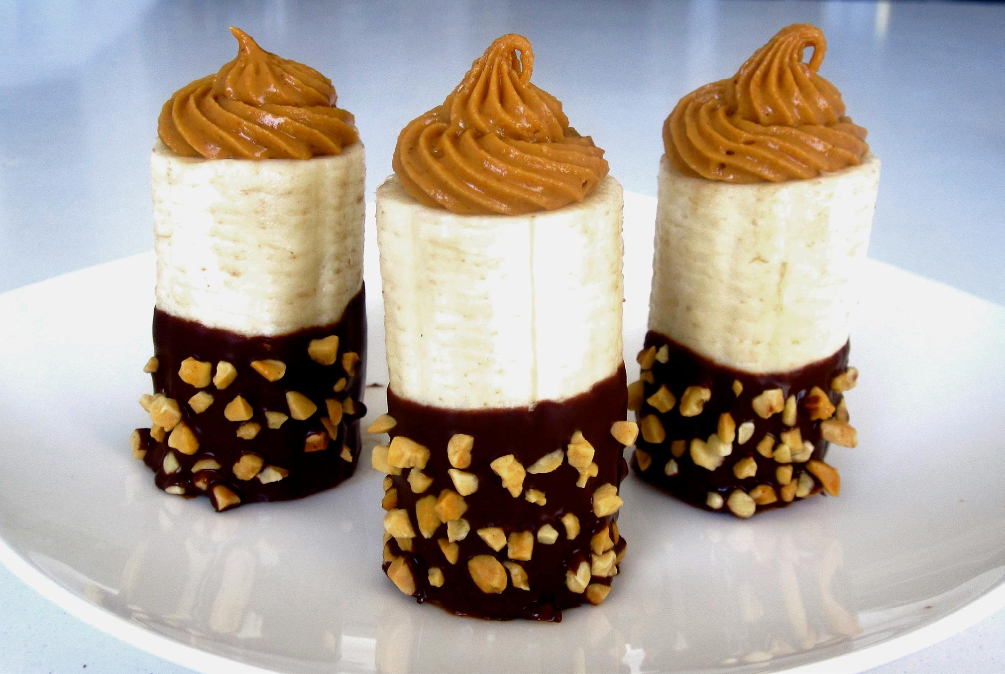 • Once dry, remove the bananas from your refrigerator. Transfer the peanut butter to a pastry bag or a zip lock bag with the corner snipped off, and pipe it into your hollowed out bananas. You can also just spoon the peanut butter into the hole for a simpler alternative.