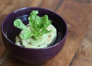 Just like the scallions, you will take the white roots of these vegetables to grow your produce. By cutting of the stalks or leafs with an inch or more and placing them into a bowl of water with the roots facing down you will be on your way. You want to make sure the roots are in water but you don’t want to submerge the entire plant. Make sure to place the bowl into a sunny window and spritz it with water weekly to keep the top of the plant moist.