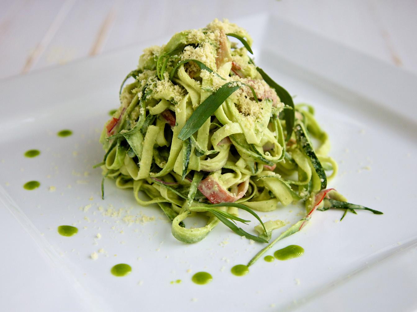 Garnish with tarragon oil, a few sprigs of tarragon and the macadamia parmesan.