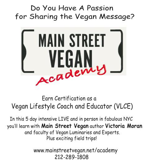 Main Street Vegan: Everything You Need to Eat Healthfully and Live CompassionVictoria Moran, Tarcher Penguin 2012. Victoria is the author of eleven books, a vegan lifestyle coach in private practice, and the director of Main Street Vegan Academy, training and certifying vegan lifestyle coaches. Learn more about www.mainstreetvegan.net.