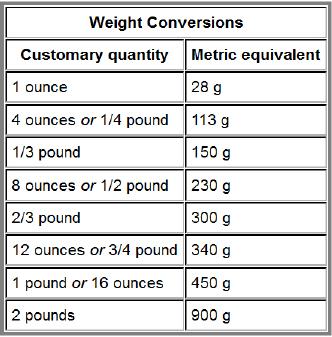 Weights can be converted with the following table. Note that the ounces referred to in this table are not the same as fluid ounces.