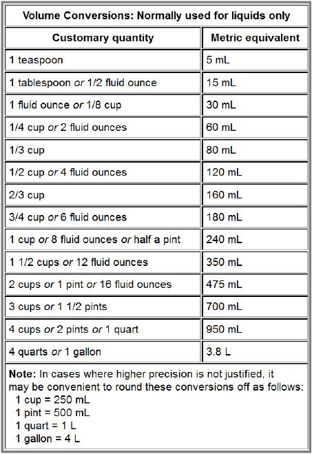 Liquids can be converted to liters or milliliters with the following table. Small volumes (less than about 1 fluid ounce or 2 tablespoons) of ingredients such as salt, herbs, spices, baking powder, etc. should also be converted with this table. Do not use this table to convert other non-liquid ingredients.