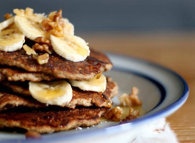 Pancakes are one the most comforting comfort foods we can think of, and Sarah’s Gluten-Free Banana Bread Pancakes take everything that’s delectable about this breakfast dish and wrap it up with even more thick, fluffy, syrupy goodness. The perfect pairing of walnuts and bananas in these pillowy pancakes becomes even more heavenly with rich maple syrup drizzled on top and optional grated dark chocolate as a garnish. A lazy weekend cozied up in bed was all the inspiration that Sarah needed to escape for just a few minutes to the kitchen to whip up a batch of these beautiful cakes. Just a quick spin in the food processor turned tasty walnuts into walnut flour, the nutty base to these gluten-free pancakes. {B}