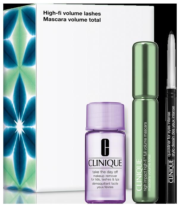 4Estuche Clinique Máscara De Pestañas High Impact: Máscara de pestañas negra High Impact, tamaño venta 7ml + Delineador negro High impact liquid liner, tamaño venta 0,34 g + Bálsamo desmaquillante Take
