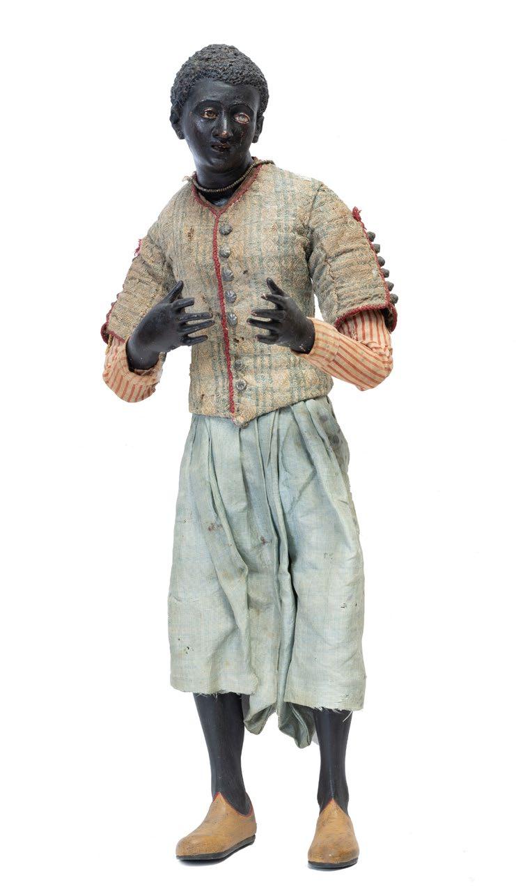 testa e arti in legno e terracotta policroma, abbigliato con giacca ricamata, camicia a righe gialle e rosse, grandi bottoni dorati, braghe azzurre
